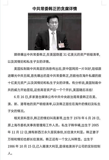 3月8日,推特網友貼出韓正的貪腐詳情,稱「網傳中共政治局常委韓正的貪腐詳情。不管是什麼背景什麼情況下捅出來的,有名有姓,妻子、情人、孩子,國籍、財產天文數字······,詳實有據。相信所有中共高官中官都有貪腐的巨額資產存在海外。中國人,你憤怒嗎?!五毛六毛,你要捍衛他們嗎?!」