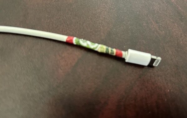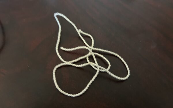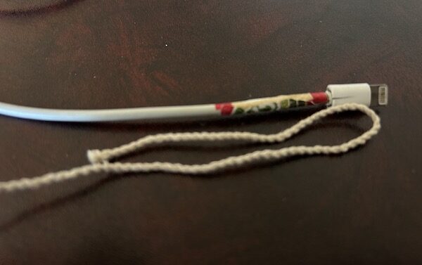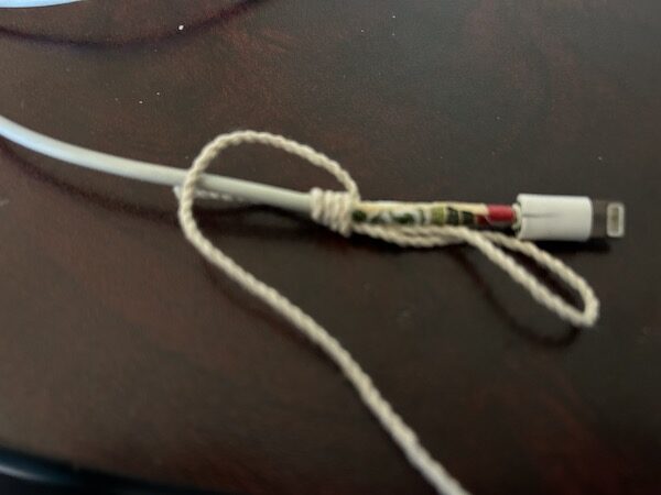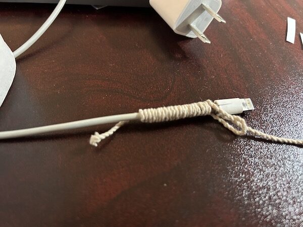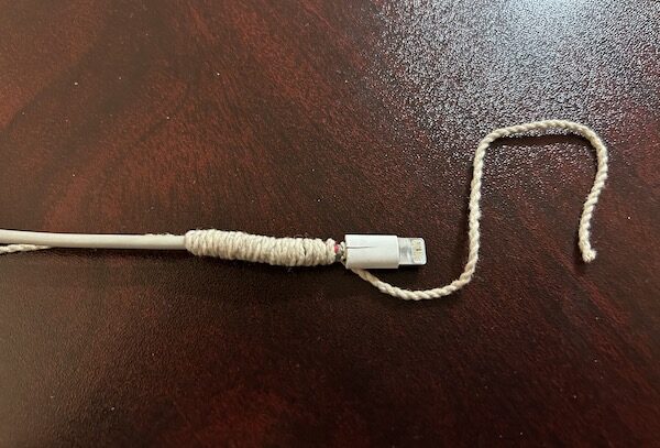 8.最後我們還要加上一層防護,取出一根細線繩,將線的一端折疊起來,貼和在充電線上。