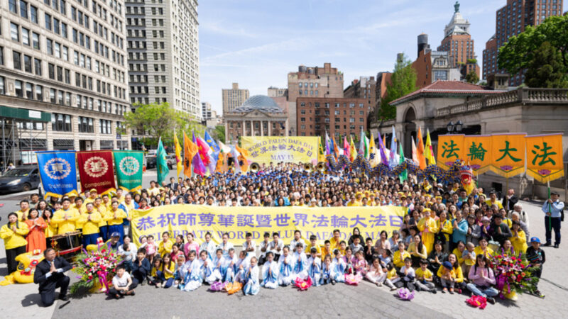5月7日,美國纽约法轮功学员在曼哈顿联合广场,舉辦大型文艺演出,庆祝法轮大法洪传31周年,恭祝師父生日快樂。