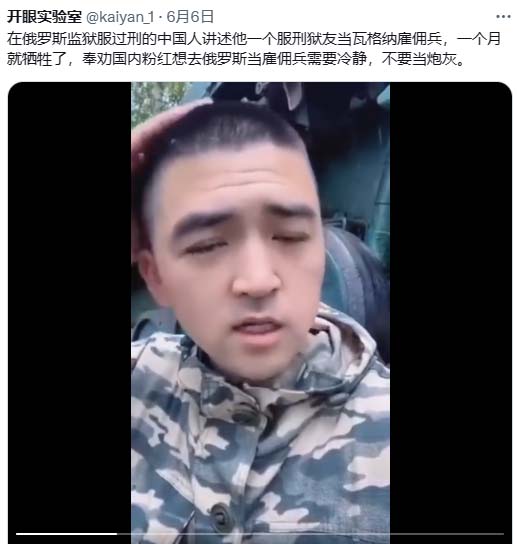 日前又有中國人在網上發視頻稱,和他一起在俄羅斯監獄服刑的一個「哥們」爲了出獄加入了瓦格納軍團,去年11月加入,12月就被打死了。
