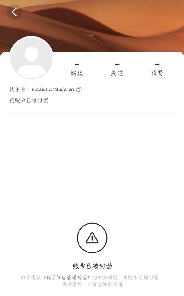 6月7日,網上傳出截圖顯示,快手帳號「守護天下的人」已被封號。還有網友爆料,該帳號博主在快手上還有幾個帳號,也一起被封了。