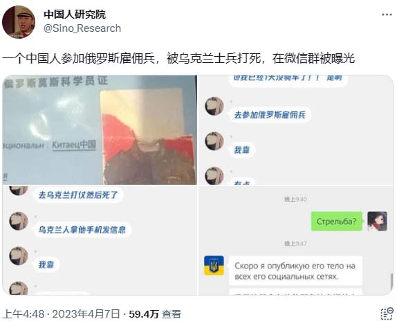 今年4月,曾有網傳視頻和截圖顯示,疑似一名參加俄國雇傭軍的中國留學生被烏軍打死,烏克蘭軍人使用他手機上的微信發布各種信息,曝光他的身分。