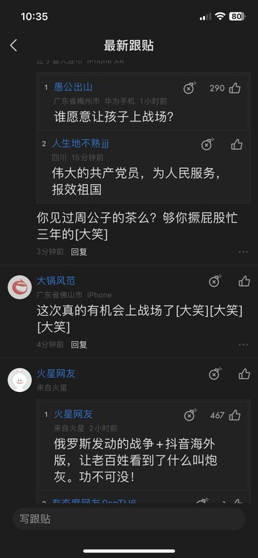 有網友說,「真的有多少人願意賭命?有多少家長希望看到自己的孩子送死?宣傳搞得震天響,也應該讓領導的子女先上戰場。」有人回應,「中國人願意賭命的多了去了。就是招不到好的,去山區招矮丑窮蠢笨,能招到一堆。」「技術兵種根本就不是蠢笨之人能幹的明白的。這樣的人硬讓他上去培訓,他不但不會有戰鬥力,反而更可能是破壞了戰鬥裝備。」
