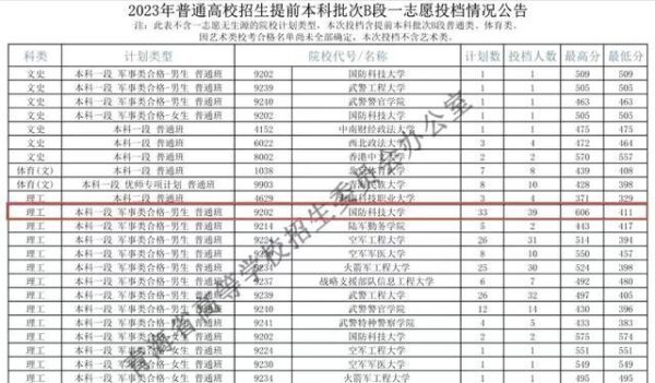 青海省發布的提前批投檔情況顯示,多個軍校專業的投檔人數與計劃招生人數持平,或略微高於招生人數。素有「軍中清華」之稱的國防科技大學,最低投檔分數線竟然只有411分。