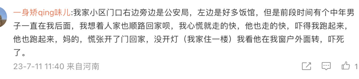 「我家小區門口右邊旁邊是公安局,左邊是好多飯館,但是前段時間有個中年男子一直在我後面,我想著人家也順路回家唄,我心慌就走的快,他也走的快,嚇得我跑起來,他也跑起來,媽的,慌張開了門回家,沒開燈(我家住一樓)我看他在我窗戶外面轉,嚇死了。」