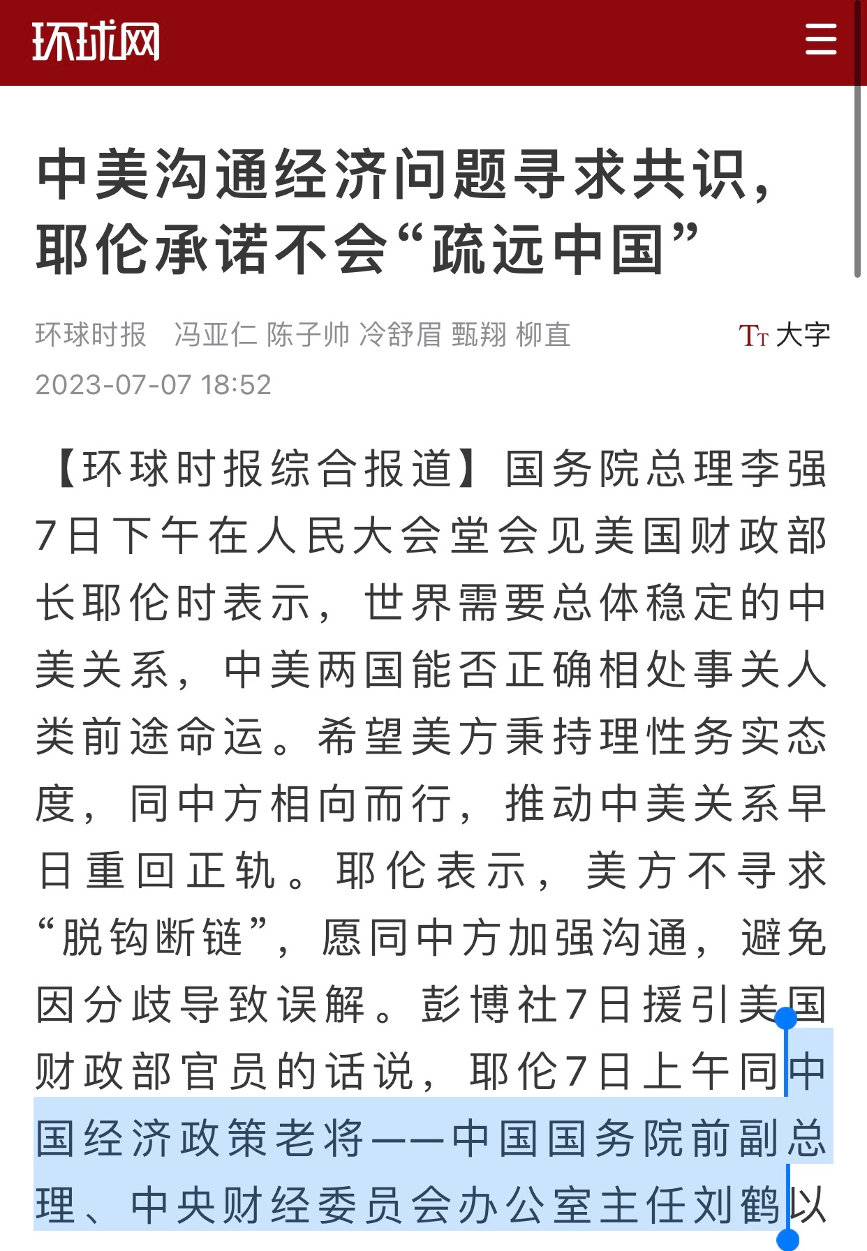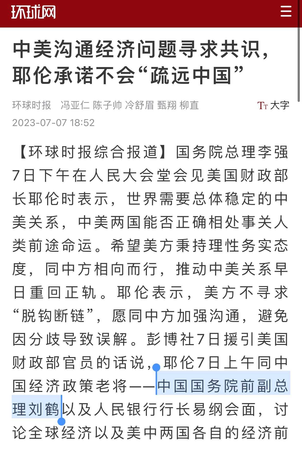 7月7日,《環球時報》官網環球網發表一篇報導,援引美媒彭博社消息稱,來訪的美國財政部長耶倫(Janet Yellen)當天在北京會見了中共「國務院前副總理、中央財經委員會辦公室主任劉鶴」。