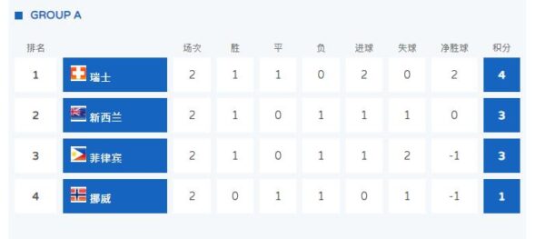 次輪過後,瑞士隊1勝1平,積4分,占據榜首;新西蘭和菲律賓同為1勝1負積3分,緊隨其後;挪威1平1負,僅得1分墊底。目前,A組形勢混亂,沒有球隊確保晉級,而末尾的挪威也沒有提前被淘汰。下一輪,東道主新西蘭隊將對陣瑞士,菲律賓與挪威交手。除了挪威外,其它三隊獲勝將確保晉級;如果挪威贏球、瑞士輸球,兩隊將比淨勝球,一較高下。