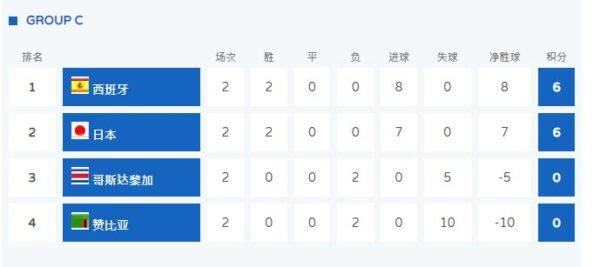 本輪過後,取得二連勝的西班牙和日本隊同積6分提前晉級,哥斯達黎加和贊比亞皆為二連敗,積0分提前出局。西班牙憑藉8個淨勝球,比日本隊多一個,排名C組第一。第三輪,西班牙和日本直接對話,爭奪小組第一。贏球的球隊將獲得小組第一,平局的話,西班牙隊將以第一名身分晉級淘汰賽。