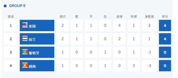 E組第二輪迎來一場巔峰決戰——上屆世界盃冠軍美國隊與亞軍荷蘭隊再次交手。首輪比賽,美國隊以3:0完勝世界盃「新軍」越南隊,並且讓對手沒能完成一腳射門。荷蘭隊則以1:0擊敗葡萄牙。