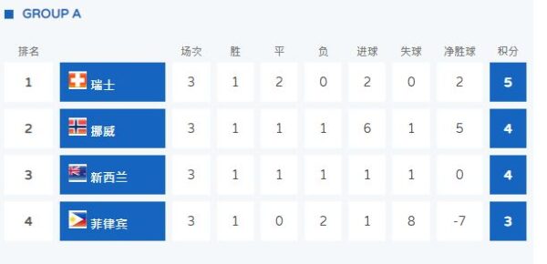 東道主新西蘭女足在揭幕戰,一球力克前世界盃冠軍挪威隊,取得世界盃歷史上的首場勝利;但她們在第二輪面對首戰0:2不敵瑞士的菲律賓女足,爆冷0:1意外輸球,讓自己陷入被動。挪威隊在次輪與瑞士隊戰平。這樣兩輪過後,瑞士1勝1平積4分,排在小組第一,占據晉級主動權。菲律賓和新西蘭1勝1負積3分,位居第二和第三。只收獲一場平局的挪威隊墊底。
