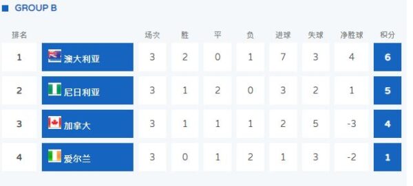 B組末輪,澳洲女足突然爆發,讓加拿大姑娘猝不及防。全場比賽,澳洲隊效率奇高,控球率只有39%,射門數10比11還不如對手,最終取得了一場4:0狂勝。尼日利亞則與愛爾蘭0:0難分勝負。最終,世界排名第10的澳洲女足2勝1負積6分,以頭名出線;排在世界第40位的尼日利亞1勝2平,積5分,以不敗戰績,位居第二晉級;世界排名第七位的加拿大積4分,排在第三位出局;世界排名第22的愛爾蘭1分墊底。