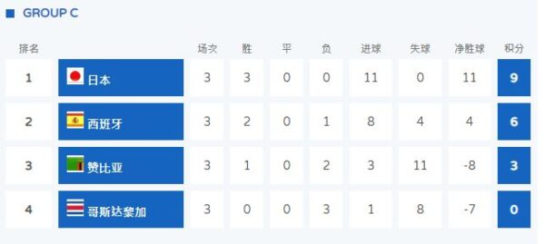 末輪,日本同西班牙直接對話,爭奪小組第一。日本隊火力全開,攻防兩端表現出色,以4:0輕取對手。三輪過後,日本三戰全勝積9分,進11球0失球,以C組頭名出線;西班牙排名第二;贊比亞在最後一戰3:1戰勝了哥斯達黎加,排在第三位,後者積0分墊底。