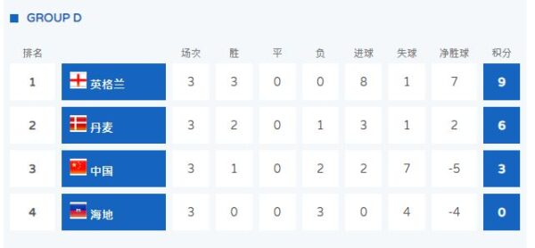 在D組,中國女足首場比賽0:1遭丹麥隊准絕殺;第二場面對海地女足,第28分鐘老將張睿犯規被紅牌罰下,中國隊十人應戰,最終憑藉王霜打進一粒點球,艱難獲勝。同組的英格蘭以兩個1:0分別戰勝了丹麥和海地,以6分,占據了小組頭名位置。中國和丹麥同為1勝1負,積3分,分列第二和第三;海地兩戰皆負墊底。