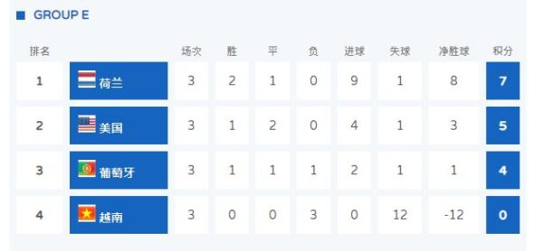 本輪過後,荷蘭隊2勝1平,積7分,排名小組第一出線;美國隊2勝2平,積5分,連續九屆世界盃全部闖進淘汰賽;葡萄牙1勝1平1負,積4分,位居第三;越南隊三戰皆負,無緣淘汰賽。