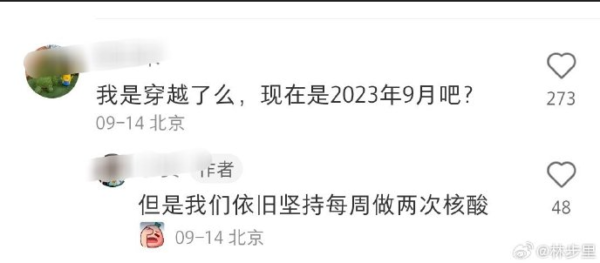 有網友問「我是穿越了嗎,現在是2023年9月吧」,不過,位置顯示為北京的網友回答說,「我們依舊堅持每週做兩次核酸」,還有一貼文說,在北京西城區看見核酸亭,裡面還有「大白」。他還轉發這一貼圖的網友帖文說,「你以為沒人防疫了,那也只是你以為,今年夏天辦活動,參加,連做了好幾天核酸,你以為不用防了,實則……」