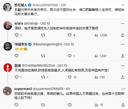 還有網友表示:「把恐怖襲擊硬說成是巴以衝突,王公公太壞了。」「大流氓說你們文明世界要和小流氓談判。」