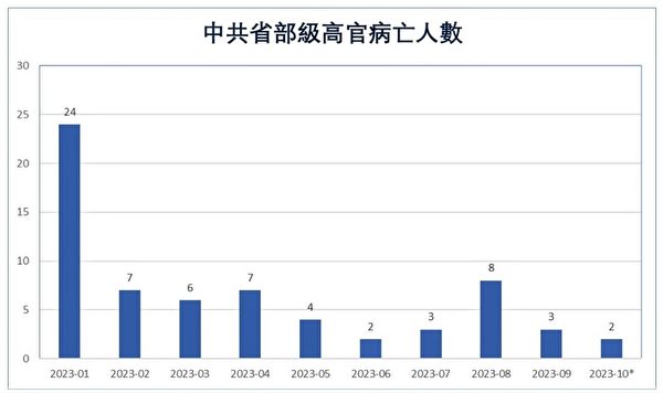 2023年1月至10月逐月病亡高官人數分別為:24、7、6、7、4、2、3、8、3、2人。