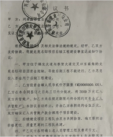 2021年8月,常年在當地做房地產開發的王小文、徐慶利夫婦接觸到龍苑小區,在當地香鹿山鎮政府大力促成及見證下,王小文持有的洛陽宇豪置業有限公司(下稱宇豪公司)與鑫諾公司簽訂了協議書,接手了龍苑小區的爛尾樓盤。