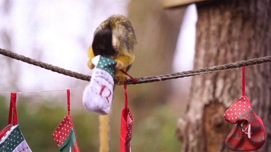 這不,飼養員剛掛好聖誕襪,這群拖著長尾巴的小東西,就迫不及待地衝出來,熟練地從襪子裡翻找它們最愛吃的小零食。