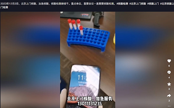 12月3日,有北京網友發布視頻,提供「北京上門核酸,加急服務」。該網友表示,重點單位、重要會議都需要做核酸檢測。