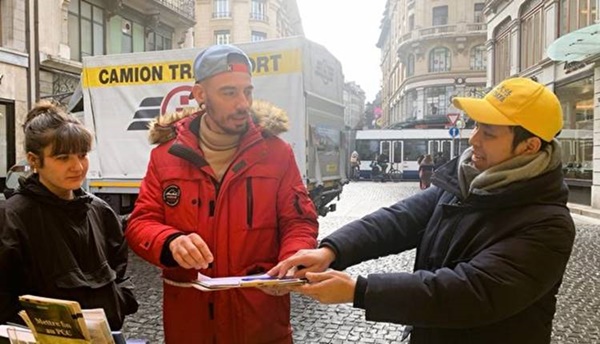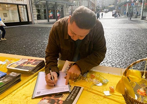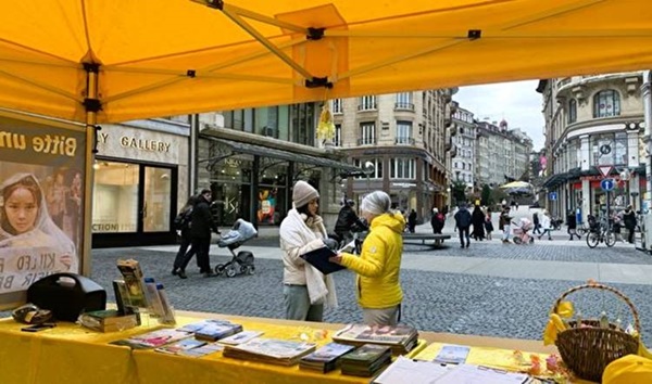 【新!唐!人:北京時間2024年01月25日訊】「真讓我流淚了!」遊客A女士在日內瓦市中心朗格馬勒廣場(Place de Longemalle)看過法輪功真相展板後激動地說,「怎麽可能發生這樣的事情?」她隨後,在簽字END CCP的徵簽表上簽下名字,並招呼丈夫過來:「快過來,你也簽名。」