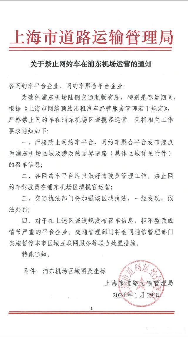 1月29日,上海市道路運輸管理局發布《關於禁止網約車在浦東機場運營的通知》,其中規定,禁止網約車平台、網約車聚合平台發布起點為浦東機場區域及涉及的邊界道路的召車信息;還要求各網約車平台禁止網約車駕駛員在浦東機場區域攬客運營,並威脅「一經發現,依法處罰」。