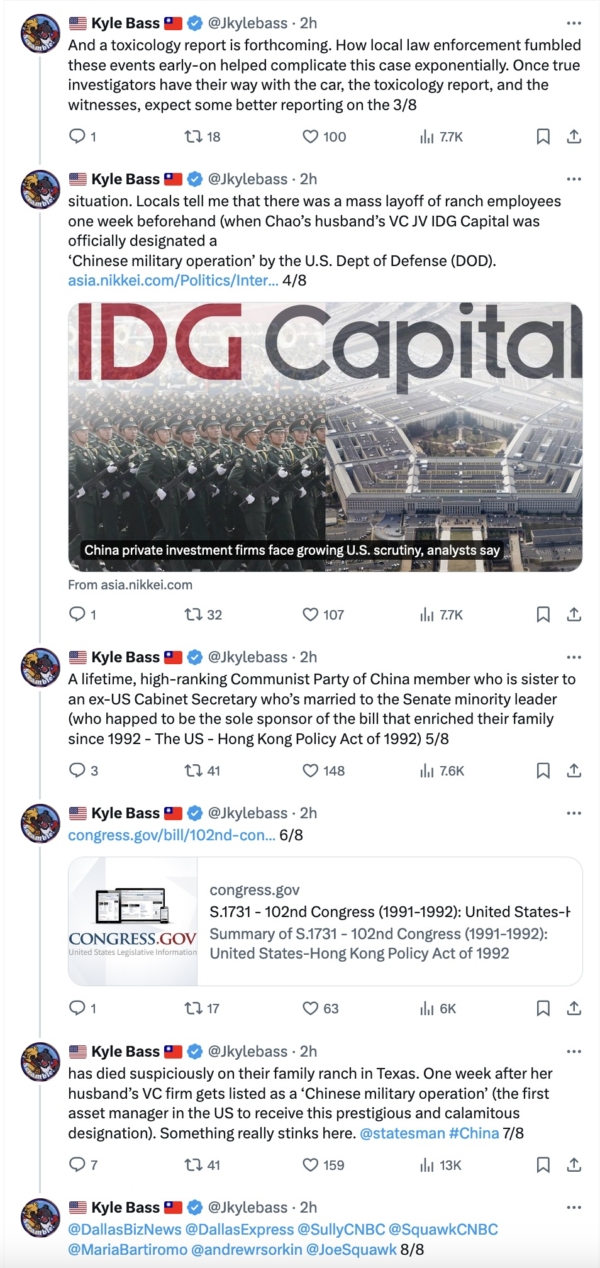 不過,有推友轉了一張六個遺失貼文的網頁截圖。凱爾‧巴斯在後面的貼文中表示,當地人告訴他,趙安吉離奇死亡一週前,事發牧場的工作人員遭遇大範圍解僱。而當時也正是趙安吉丈夫Jim Breyer的投資公司IDG Capital被美國國防部列為「中國(中共)軍事公司」之際。