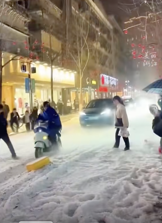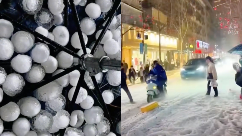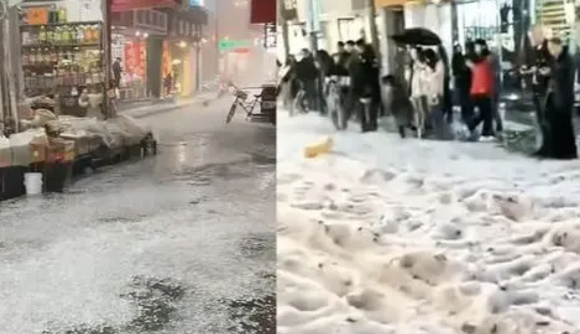 大街上的冰雹混合著雨水形成罕見的「冰河」,導致車輛擁堵,市民出行困難。當地人說「長這麼大從來沒有見過」。