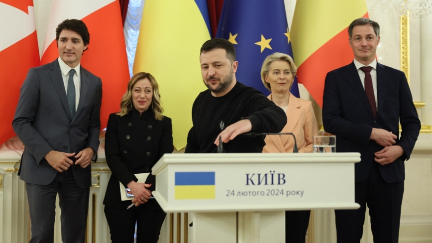 意大利總理梅洛尼、歐盟執委會主席馮德萊恩(Ursula von der Leyen)、加拿大總理特魯多(Justin Trudeau)、比利時首相德克羅(Alexander De Croo)親身前往基輔,在俄烏戰爭2周年表達對烏克蘭的支持。