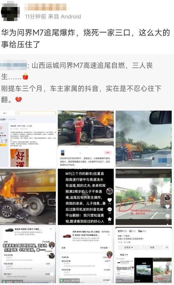 出事車主的家屬在網上控訴,事發山西運城夏縣段高速公路,當時她的弟弟駕駛剛剛提車三個月的華為問界M7,車上載著她的丈夫和剛滿2周歲的兒子。結果車子追尾澆水車,起火爆炸,車上三人全部遇難,丈夫死在路邊,弟弟和兒子死在車內,燒成焦炭。