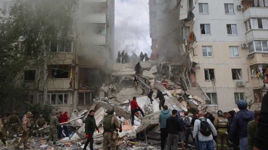 現場影片顯示,別爾哥羅德至少有10層樓的建築物倒塌。緊急服務人員搜救倖存者。