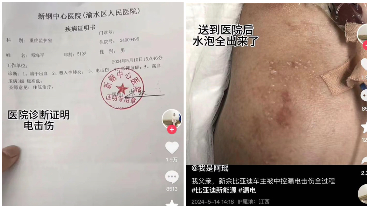 【新!唐!人:北京時間2024年05月15日訊】江西新餘一男子鄧先生購買比亞迪新能源車,不到一個月就突發意外。車子疑因漏電導致鄧先生被電擊成腦溢血,至今未醒。比亞迪回應否認漏電,稱「不排除車主突發腦溢血導致手腳麻木」,被家屬質問,如果沒有電擊,診斷書上的「電擊傷」和身上的水泡從何來?