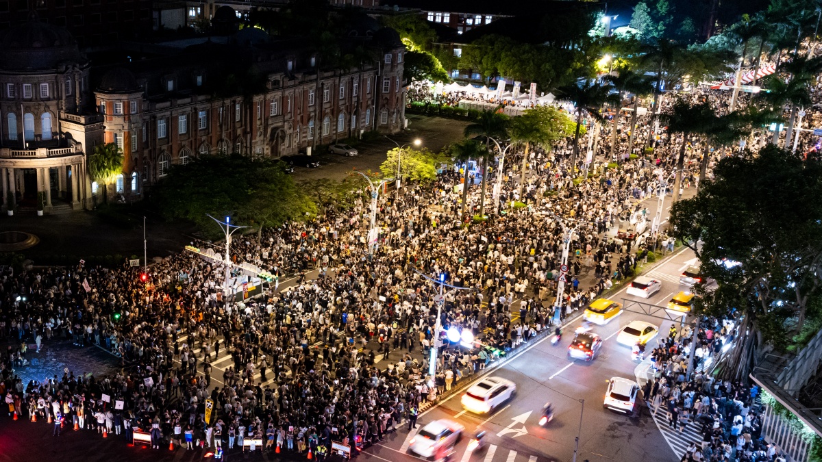 網傳視頻顯示,一直持強硬反共立場的曹興誠,晚間走上集會講台發表演說。他先是對現場的抗議民眾一鞠躬,表達感動與尊敬。