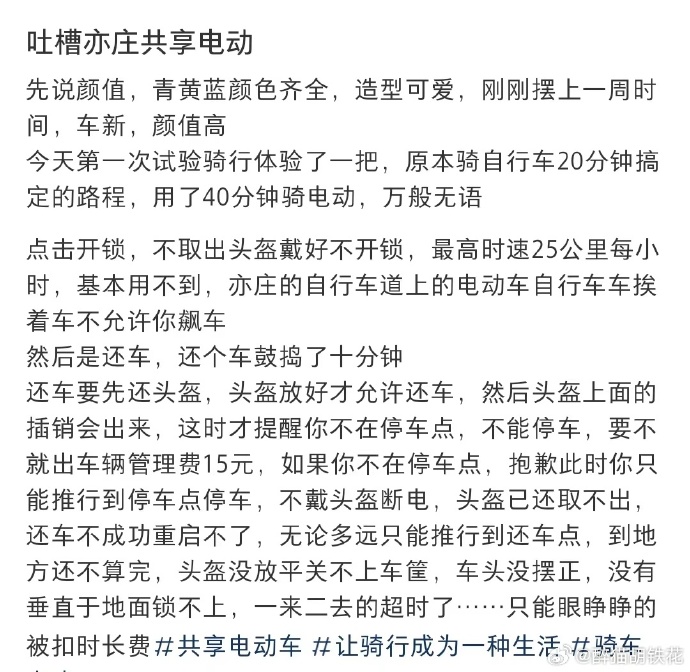 6月14日,一網友在網上吐槽在北京市大興區亦莊騎共享電動車的經歷說,原本騎自行車20分鐘搞定的路程,騎電動車用了40分鐘。