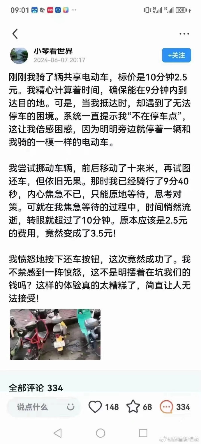6月7日,網名為「小琴看世界」的網友分享說,「剛剛騎了共享電動車,標價10分鐘2.5元,精心計算著時間,確保能在9分鐘內到達目的地,但是,當到達目的地時,系統一直提示「不在停車點」,不能停車。