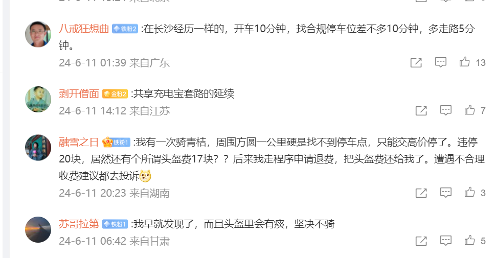 在評論區,好多人表示自己也有類似的經歷,「在長沙經歷一樣的,開車10分鐘,找合規停車位差不多10分鐘,多走路5分鐘。」「有一次我超時5秒還上,多花了1.5,就是在合肥。」「湖南,我有一次騎青桔,周圍方圓一公里硬是找不到停車點,只能交高價停了。違停20塊,居然還有個所謂頭盔費17塊?後來我走程序申請退費,把頭盔費還給我了。」「有次著急辦事,騎了個共享電動車。到了目的地,想停車卻發現附近沒有停車點。我焦急地四處尋找,最後只好停在了路邊。結果,不到半小時,我就收到了調度費的扣費通知。那一刻,我真的覺得被『坑』了。」