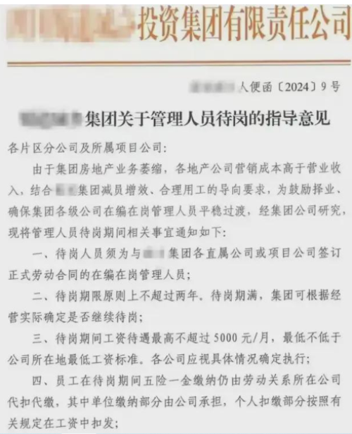 網傳該公司近日發布的《關於管理人員待崗的指導意見》稱,「受集團房地產業務萎縮、各地產公司營銷成本倒掛等多重因素影響,公司決定對全體管理人員實施待崗措施。」