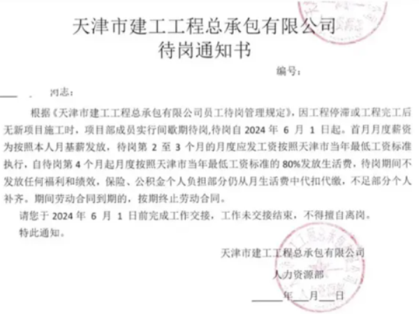 網絡上已曝光的《天津市建工工程總承包有限公司員工待崗管理規定》稱,因工程停滯或工程完工後無新項目施工時等原因,公司決定從2024年6月1日起,對項目部成員實行間歇待崗。