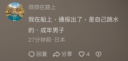 截至目前,官方尚未通報落水乘客詳情,但有乘客在社交媒體發貼文稱:「我在船上,通報出了,是自己跳水的、成年男子。」