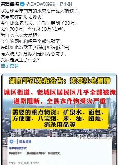 在受災嚴重的湖南平江縣,日前縣政府發出「接受社會捐贈」的公告,要求全國民衆給當地紅十字會捐款捐物資。結果網民響應者很少,網上評論區甚至變成了嘲諷大會。網民們用各種辛辣的語言,對地方當局和中共的紅十字會冷嘲熱諷。