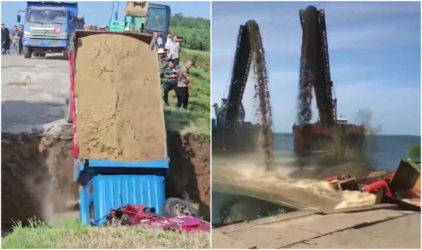根據網傳大量視頻和照片,最初潰口只有幾米寬,地方當局卻用卡車拉著散沙封堵,後來又用液態水泥噴灑,結果是散沙和水泥很快被急流沖走,根本不起作用,潰口越來越大,最後一發不可收拾。