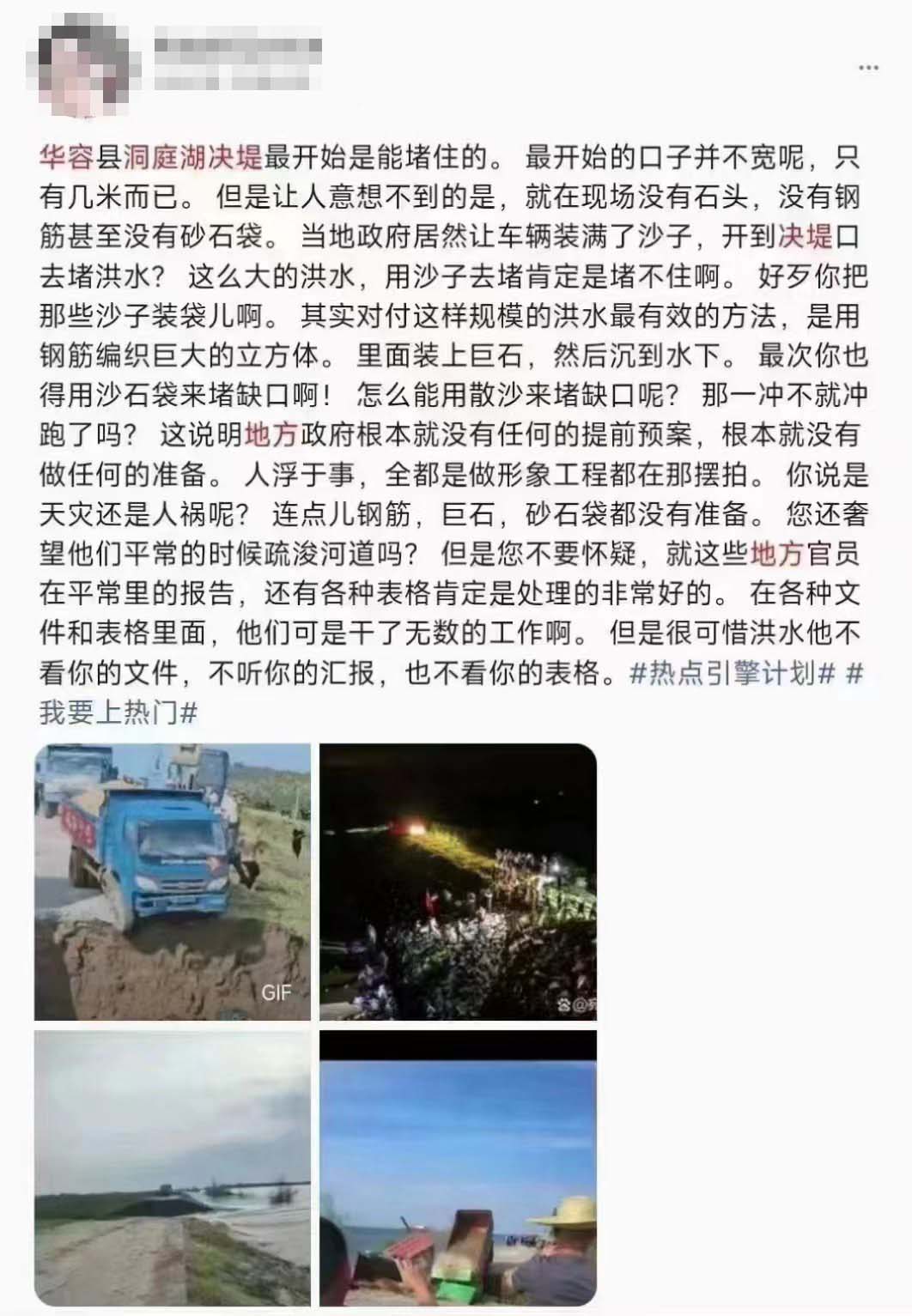 這次華容縣團洲垸的洞庭湖堤壩崩潰,官方的表現更是讓網民失望至極。