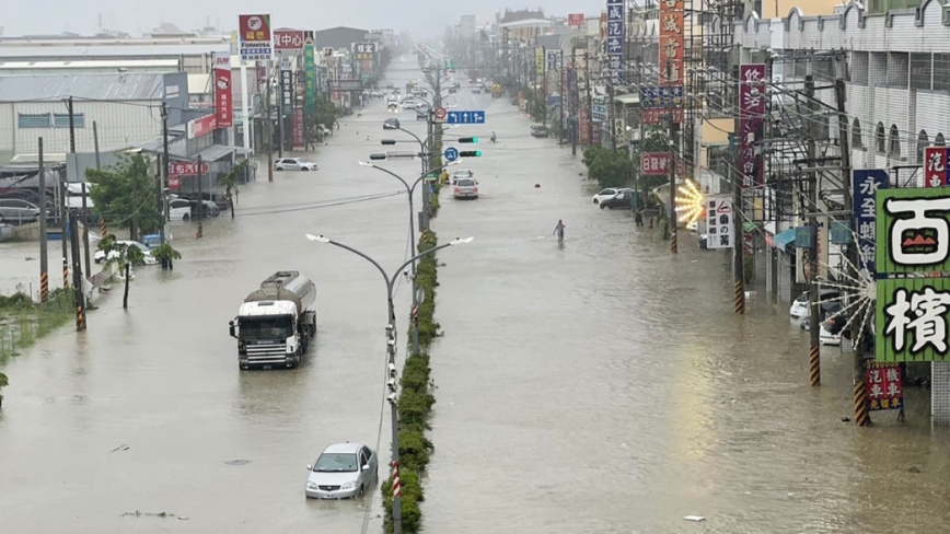 左營一處大樓,滾滾黃水沿著車道傾瀉而下,居民合力希望擋住防水閘門。颱風造成高雄上萬戶停電,因為到處都淹水,電力搶修被迫放緩,甚至連台電民族變電所也泡在水中,市府緊急調派抽水機。