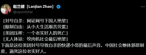 趙蘭健在帖文中指出,是中國社會整體的邪惡制度,逼死這位快遞小哥,而他的死亡也反映出網證網號下國人的絕望,生活的艱苦勞累,「美團(的)壓榨」,以及「絞肉機社會最後(的)絕望」。
