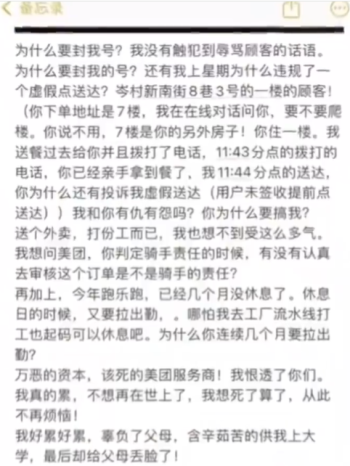 他寫道:「萬惡的資本,該死的美團服務商!我恨透了你們,我真的累,不想再在世上了,我想死了算了,從此不再煩惱。」