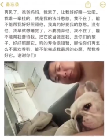 這名快遞小哥還在備忘錄中給父母留言,為辜負了含辛茹苦供自己上大學的父母而表示慚愧,並委託父母在自己死後照顧自己所養的小狗,說這是自己的「唯一牽掛」。