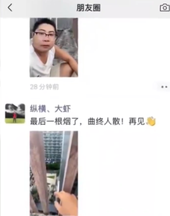 他在朋友圈發的最後一帖,上載了從高層建築的窗口往下拍攝的一個畫面,並寫道:「最後一根煙了,曲終人散!再見。」