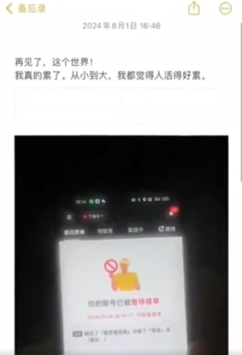 這名男子備忘錄上最後的遺言發出時間是8月1日16:46,最後一句話是:「再見了,這個世界!我真的累了,從小到大,我都覺得人活得好累。」他同時還配發了自己被美團封號的截圖。