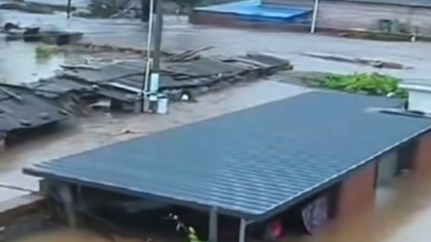 視頻聲音:「那房子已經淹沒了,前面的房子,(房頂)鐵皮都有點看不見了。馬上就到我們這個房子了。」