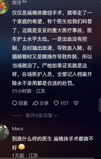 也有網友說:「僅僅是扁桃體微創手術,就帶走了一個家庭的希望,有個醫生給我們科普了,這就是妥妥的重大醫療事故,醫生護士水平太低。一是出血沒有控制,及時抽出血液,導致血入肺,在插肺管時又是瞎操作導致炸肺,所以當場就沒了。屍檢如果證實就是這樣,在場醫護人員,全部記入檔案開除永不錄用都是合適的處罰。」